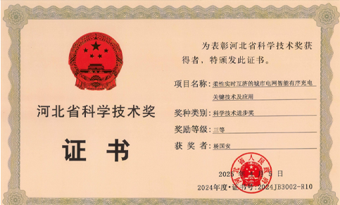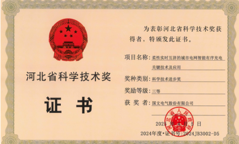 近日,2024年度河北省科学技术奖励大会在石家庄召开,国文电气股份有限公司及董事长杨国安与相关单位联合申报的“柔性实时互济的城市电网智能有序充电关键技术及应用”项目荣获河北省科学技术进步奖三等奖。