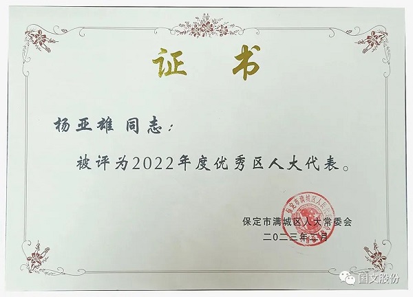 2月16日,满城区人大常委发布【2023】1号通报《保定市满城区人大常委会办公室关于2022年度“双优”评选表扬的通知》,总经理杨亚雄被评选为2022年度优秀区人大代表。