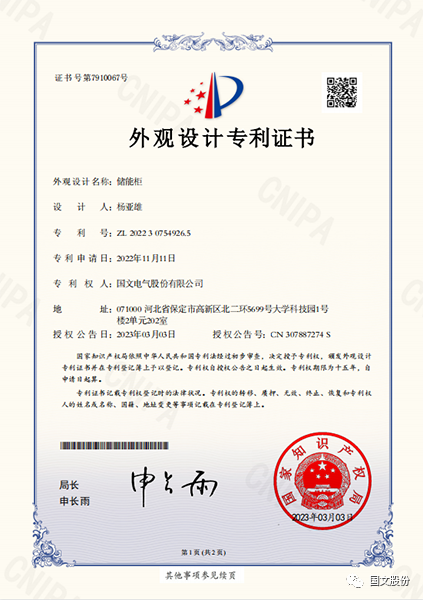3月3日,国文电气股份有限公司收到国家知识产权局颁发的储能柜《外观设计专利证书》(证书号第7910067号,专利号:ZL202230754926.5)。