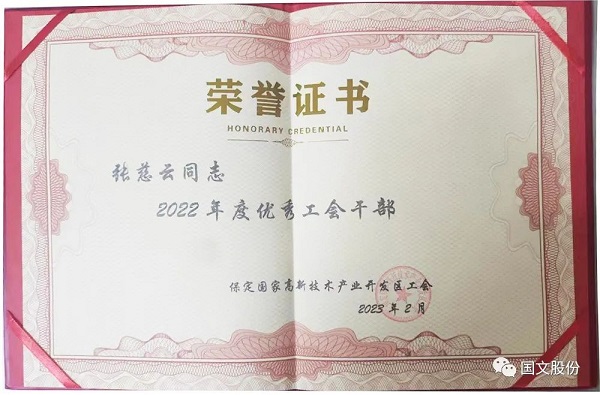 2月27日,国文工会接到保定市高新区工会通报文件,公司工会主席张慈云被评为“2022年度优秀工会干部”,办公室贺子希被评为“2022年度优秀工会积极分子”。