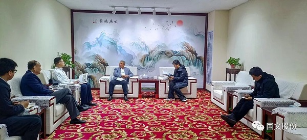 4月2日上午,保定城投能源科技有限公司总经理张成一行,来到国文股份考察;公司董事长杨国安、总经理杨亚雄率相关部门负责人接洽并座谈。