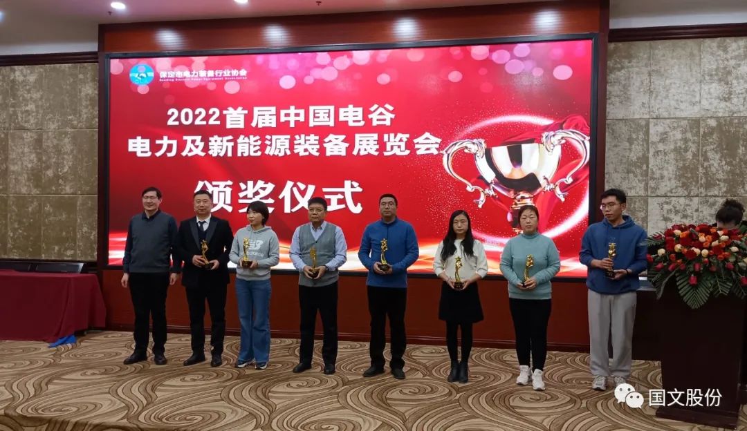 会上还对2022年度保定市电力及新能源行业创新企业、优秀企业和在“2022首届中国电谷电力及新能源装备展览会”中获奖的企业进行了表彰。国文股份以新能源汽车智能充电站产品荣获展览会大奖。