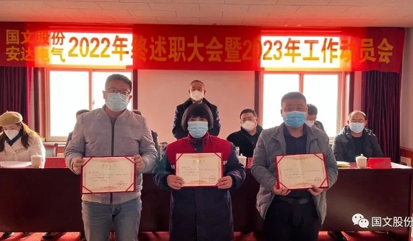 1月7日上午,国文股份安达电气第二届“阿甘奖”评选结果揭晓,董事长杨国安为获奖者颁奖。国文股份新能源事业部技术工程师靳章、安达电气供应部经理王群、生技部硫化车间员工李士青,被授予“阿甘奖”证书,获4800元奖金。