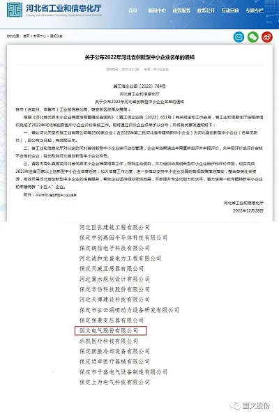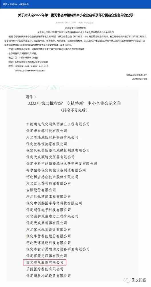 12月9日,河北省工业和信息化厅发布《关于拟认定2022年第二批河北省专精特新中小企业名单及部分更名企业名单的公示》,国文电气股份有限公司被认定“河北省专精特新中小企业”。